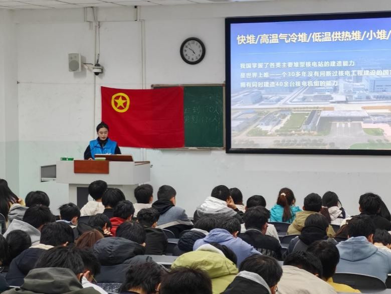 为深入学习贯彻“十五五”规划精神,引导广大青年学子从“两弹一星”精神中汲取奋进力量,11月25日,我院“两弹一星”主题宣讲团“星火砺甲团”应邀走进水利202402、水利202403、水利202404、能动202401、能动202404、信科202402六个班级联合举办的“深悟全会精神,奋进崭新征程”主题班团活动。在10教A202教室,宣讲团为现场师生带来了一场兼具思想深度与情感温度的精神宣讲,生动再现中国核工业奋斗史诗,在青春校园中掀起传承红色基因、共话未来发展的热潮。