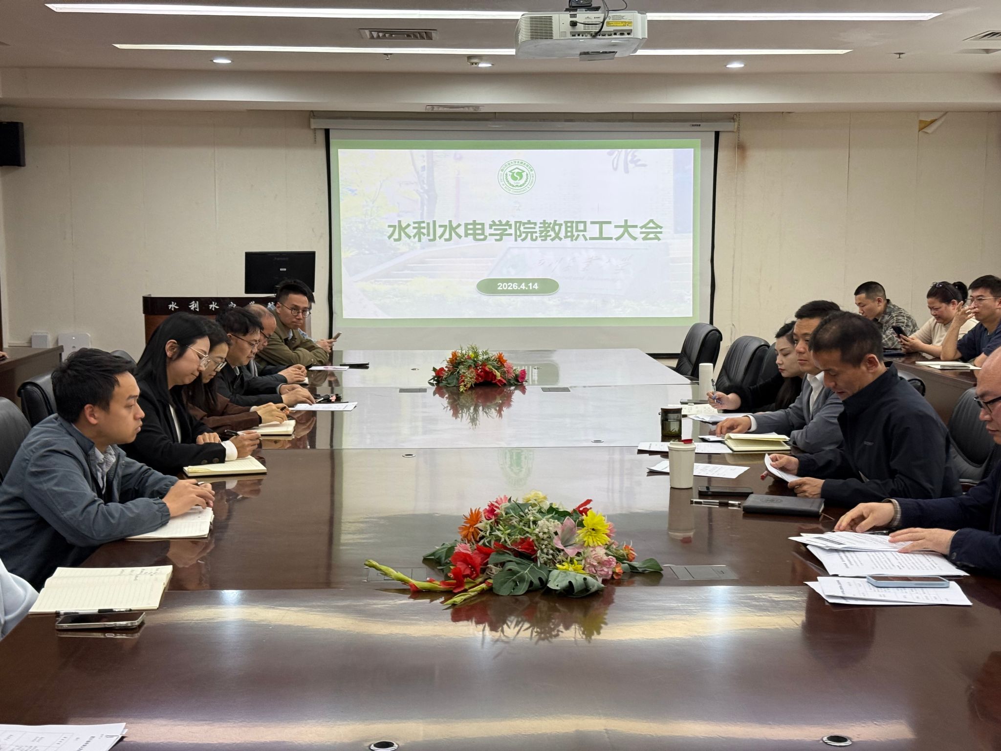 4月14日,学院召开全体教职工大会。院长曹迎、党委书记马海、副院长胡建、副院长王莹及全体教职工参加会议。会议由马海主持。