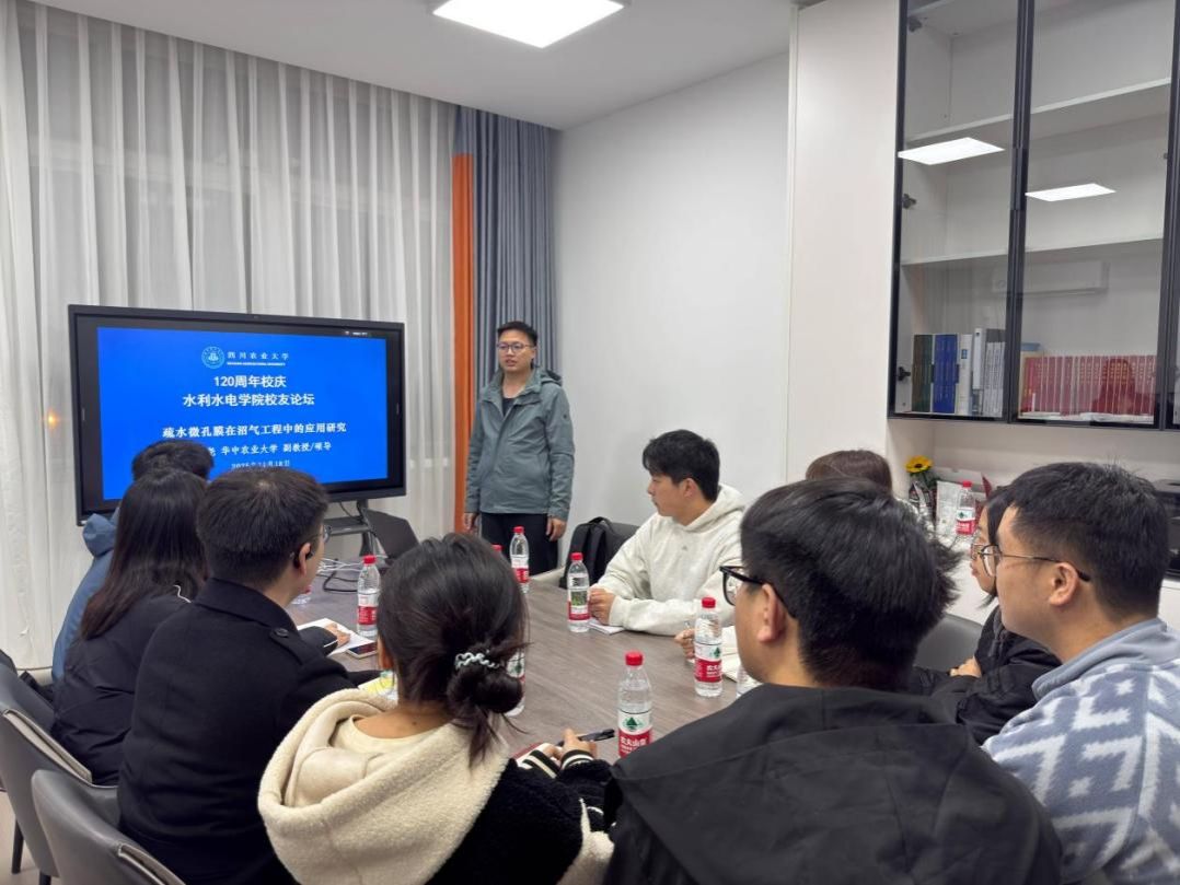 2008级农业建筑环境与能源工程专业校友、现任华中农业大学工学院副教授贺清尧,于11月18日重返雅安校区,在第四教学楼教职工之家与水利水电学院的师生们开展校友返校学术交流。副院长胡建以及能动系曾赟教授、杨萍副教授等多位教师及十余名研究生参会,共同探讨膜技术在沼气工程与农业资源利用中的创新应用与发展前景。