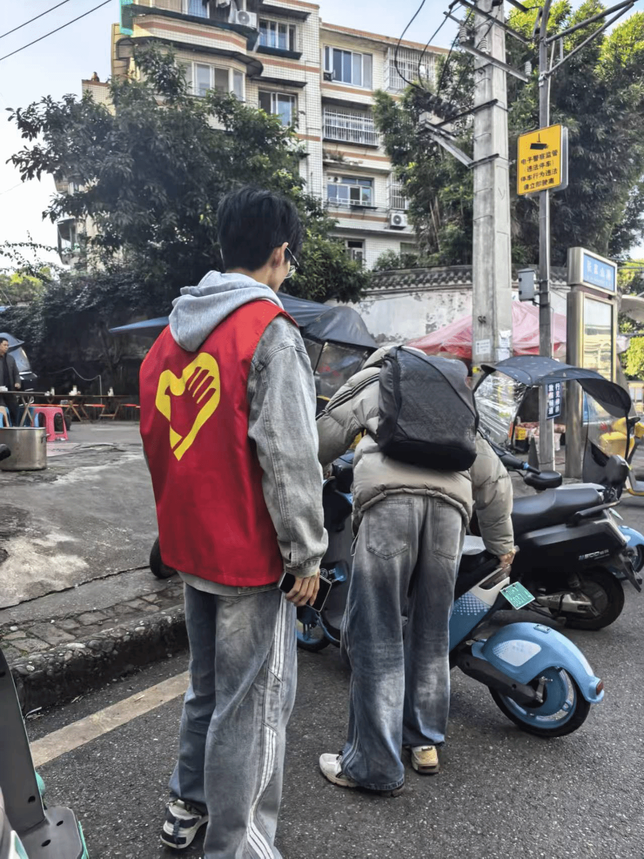 活动期间,志愿者们佩戴统一志愿标识,分为两组,积极投入到志愿服务当中,遇到正在违规停放的居民,耐心说明乱停乱放对消防车通行、老人小孩出行的潜在风险,协助车主将车辆移至指定停车区;对于长时间无人认领的“僵尸车”,则在社区工作人员见证下,统一搬运至临时存放点。“同学,你看这边画了黄色停车线,把电动车停在这里,既不挡路又安全,下次你可以直接停这儿。”志愿者林雅贞一边帮路过的同学推车,一边讲解规范停车的好处。