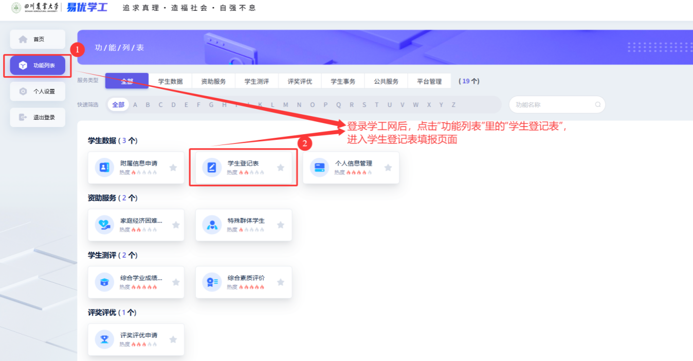 登录“学生管理系统”→“功能列表”→“学生登记表”(图1)。核实修订个人基本信息,完成《四川农业大学学生登记表》线上填报,填写格式可参见附件2:《四川农业大学学生登记表模板》。