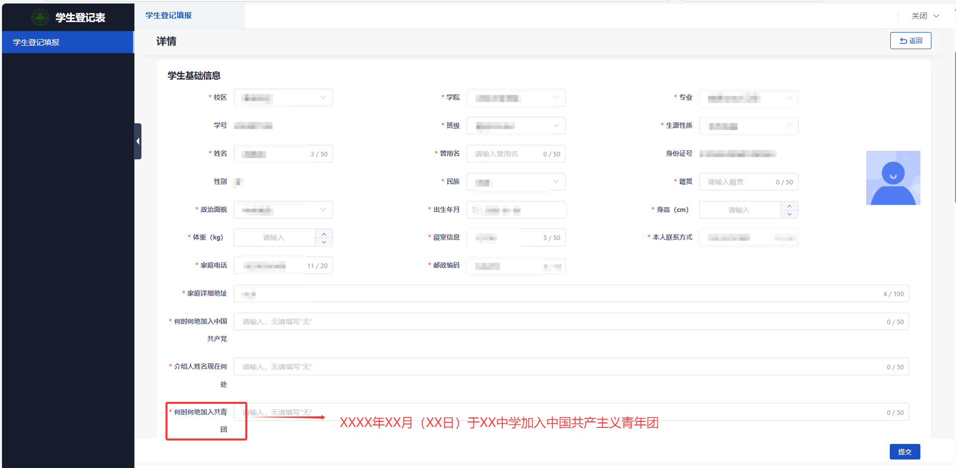 (二)请班主任提醒各位同学认真填写,仔细核实相关信息,避免因漏填错填对学生毕业后政治审查等关系个人发展的事宜产生影响。