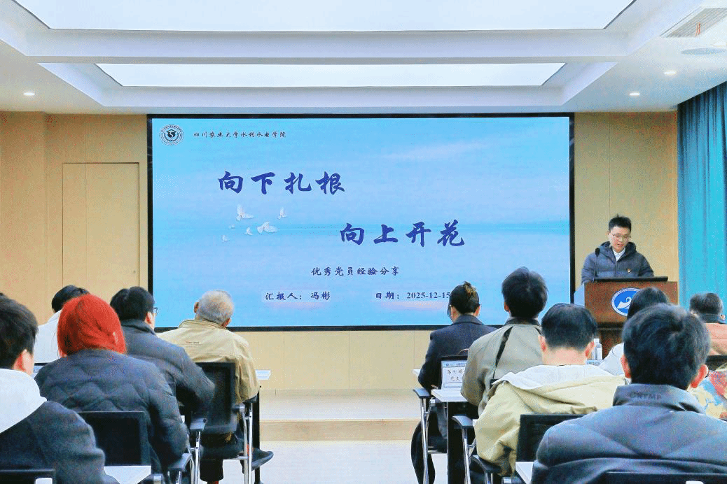 在主题分享环节,学院土木水利研究生党支部代表冯彬立足水利专业特色,结合团队在农田水利、水资源优化配置等领域的科研实践,围绕课题攻坚、团队协作、未来发展等关键内容,分享了支部以党建促科研、以科研强党性的实践经验,展现了川农水利青年党员求真务实、勇毅前行的精神风貌。来自四川大学马克思主义学院党员学长余梦洁、西南石油大学徐世昊、成都理工大学方竣等其他兄弟高校的党员也相继登台,结合自身科研成长历程,从党建经验、课题探索、党员担当等方面分享心得,多元视角的思想碰撞让在场学子深受启发。
