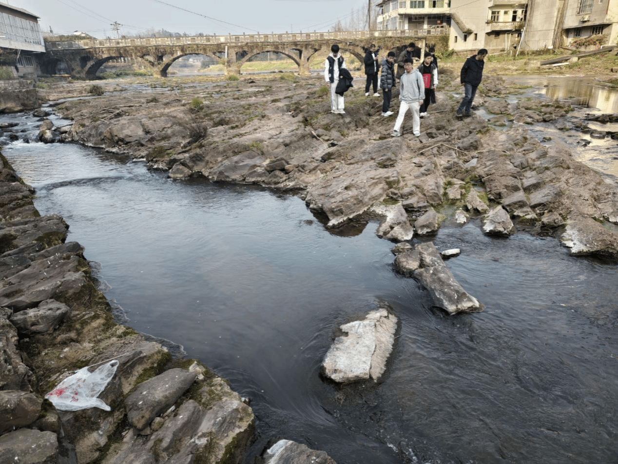 在老师的引导下,同学们不仅领略了上里古镇作为昔日“南方丝绸之路”重要驿站的古朴风貌,更沿着河岸,实地认知了河流沿岸典型的砂岩地貌特征,了解了流水千年切割塑造的力量。大家观察了河流在平缓处形成的绿堤景观,以及水流冲刷岩壁形成的独特壶穴现象,聆听了关于当地历史上因水质清冽而得“白水”古称的典故。这些生动的地质、水文与历史知识,让书本上的理论变得触手可及,深刻理解了山水与人文发展的紧密关联。
