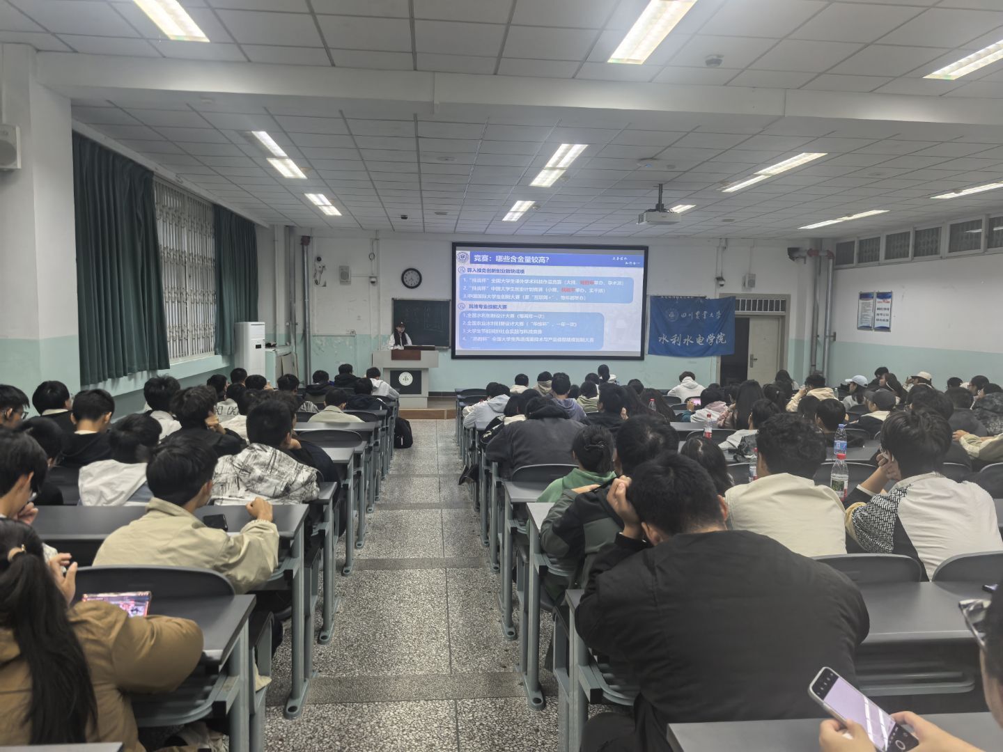 为助力学生科学规划升学路径、把握保研与考研学习等关键环节,10月24日,学院在十教A101举办了“与优秀同行”系列活动之优秀学生学习经验专题分享会。本次分享会邀请到三位荣获国家奖学金的2025届优秀毕业生:农业水利工程专业的李傲雪、能源与动力工程专业的王雄升、水利水电工程专业的边萃华,他们围绕学习生活、科研获奖、学生工作等核心内容进行了深入分享,吸引了180余名同学积极参与。
