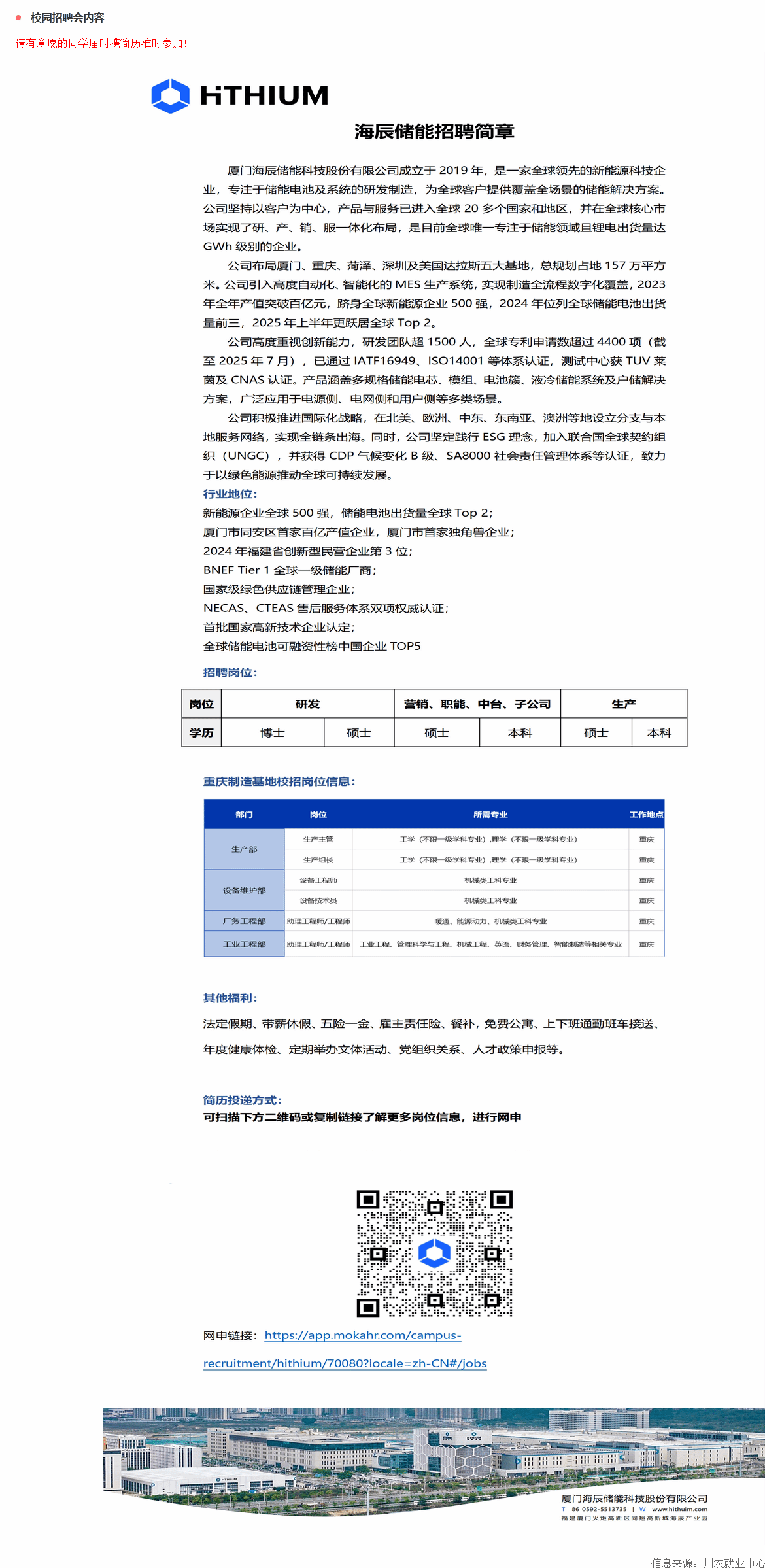 设备技术员 | 重庆市铜梁区 | 15 | 机电学院_计划人数:15 | 电气工程及其自动化_计划人数:5,电子科学与技术_计划人数:5,农业机械化及其自动化_计划人数:5 | 其他人员 | 本科 | 6000~8000 | 2025-12-09 至 2025-12-10 | lisj@hithium.com | 简历投递查看详情 |